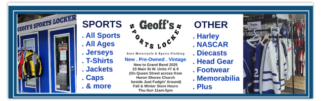 We offer a large selection of football, basketball, hockey, baseball, Harley, & NASCAR apparel. Choose from a selection of t-shirts, hoodies, jerseys, coats, jackets and much more online. Get affordable vintage sportswear clothing and memorabilia. Try shopping online with us today and we welcome you to visit our store in Grand Bend! We look forward to meeting and serving you.
